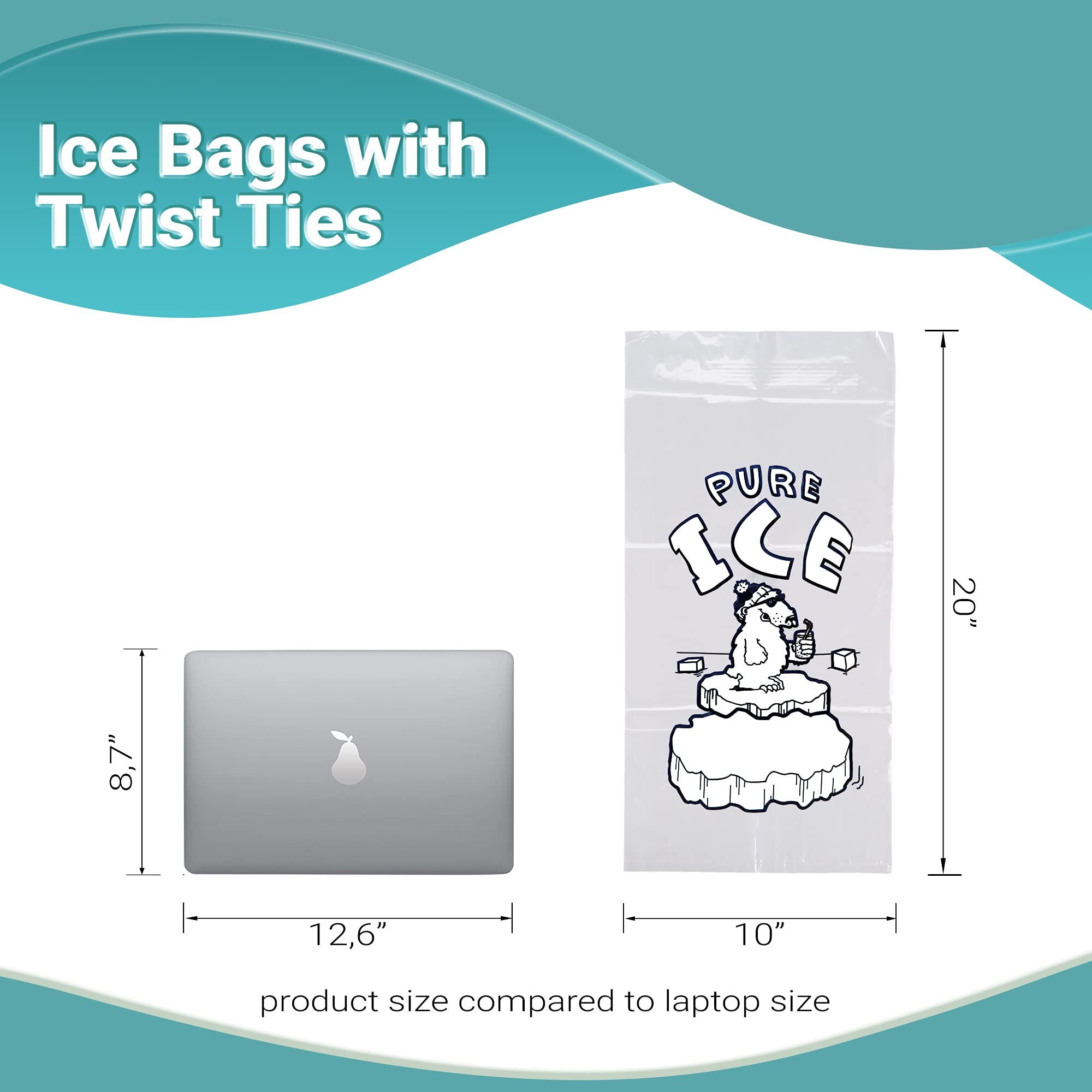 1.Pack of 1000 plastic ice bags 10" x 20", 8 lb. "Pure ice" plastic ice bags are pre-printed and the large opening makes packaging ice cubes easy. These 8 pound ice bags with twist ties are 1.5 mil thick, measure 10" wide and 20" long. Each ice bag is pre-printed with an image of a polar bear standing on ice with the text "pure ice".