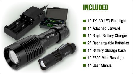 1 x TK130 LED Flashlight 1 x Attached Lanyard 1 x Rapid Battery Charger 1 x AAA Battery Holder 2 x Rechargeable Batteries 1 x Storage Case for Batteries 1 x Mini E300 LED Flashlight (battery not included) 1 x User Manual An excellent flashlight choice for camping, hiking, other outdoor activities, security and disaster prep kits!