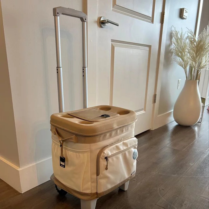 Features: Dry Storage Compartment, Cup Holder, Retractable Handle, Outside Storage Pocket, Wheels